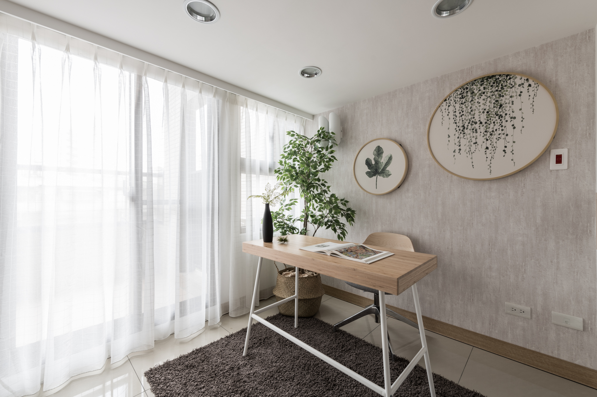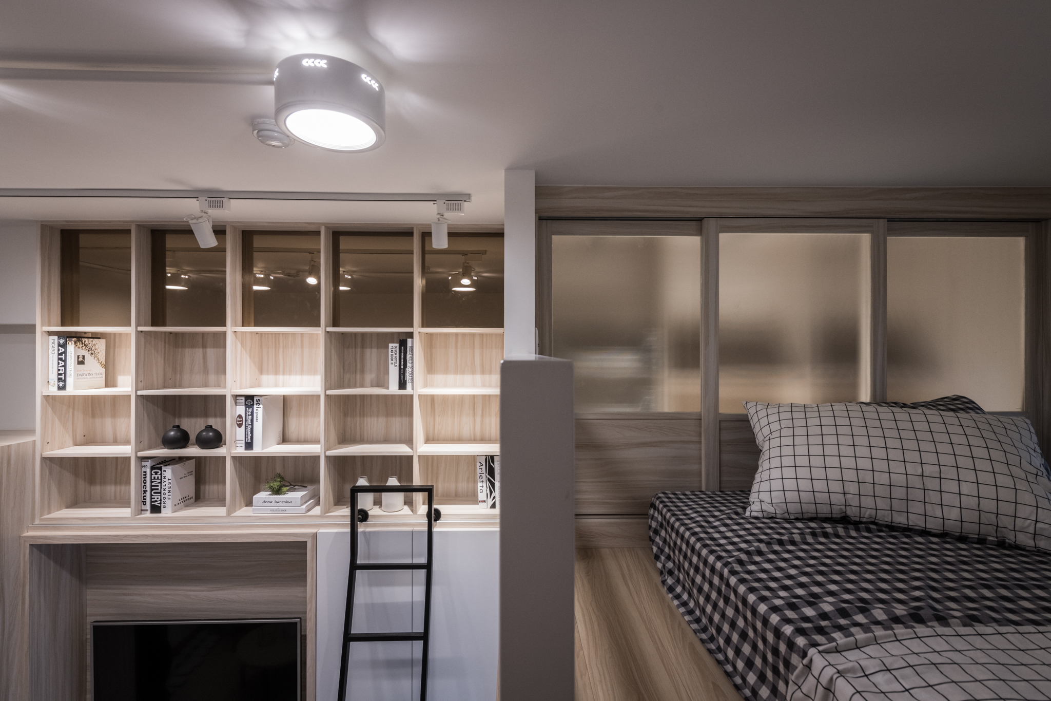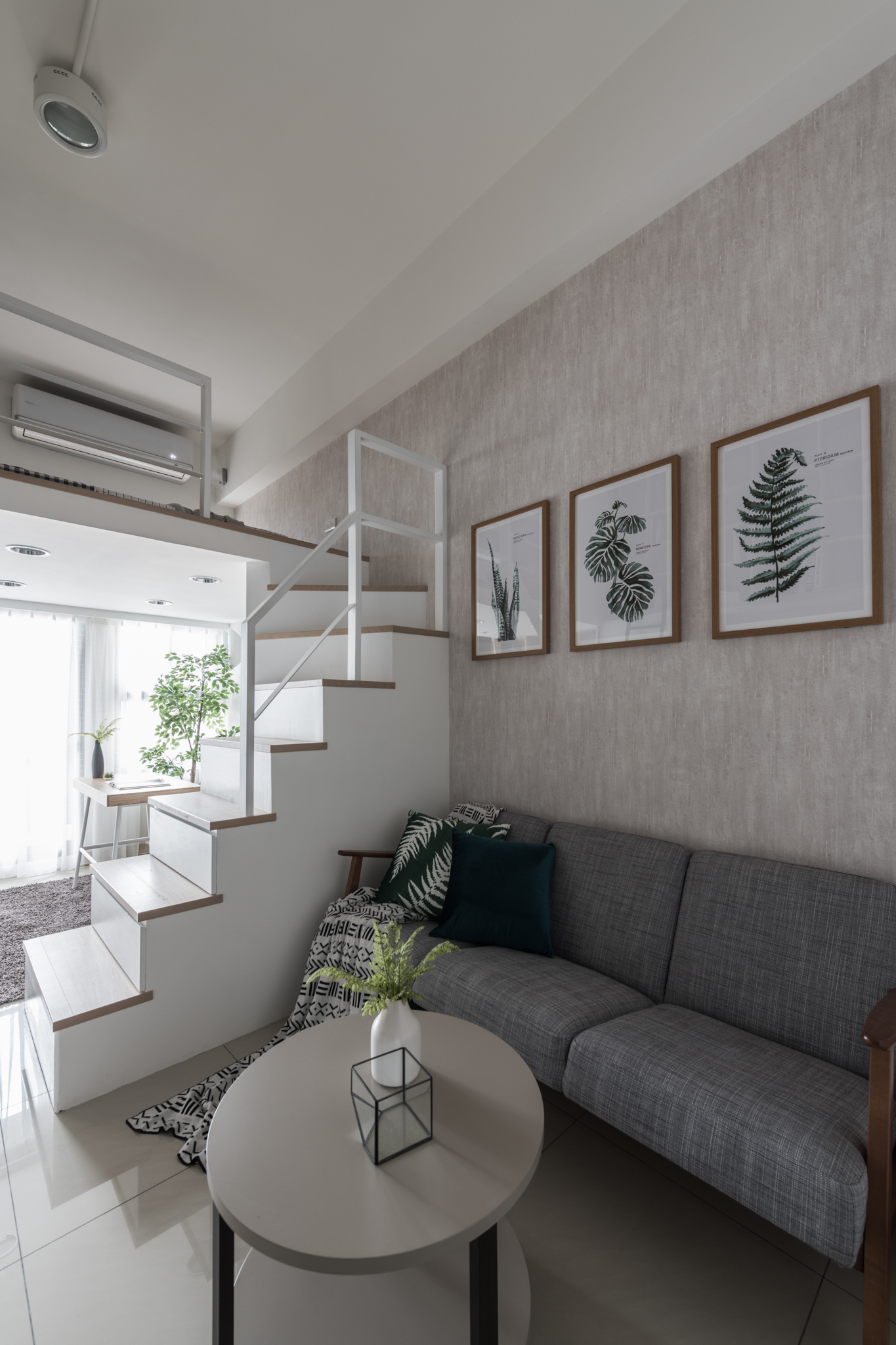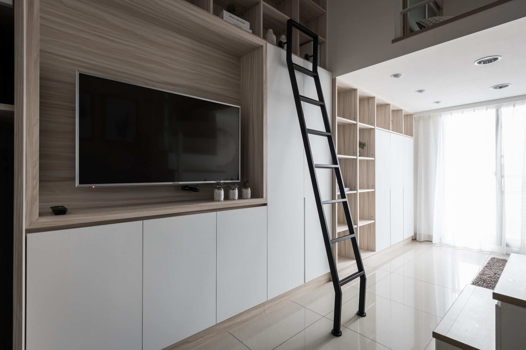 日式風格我們選擇了白與淺木皮的搭配運用,配色試圖放大空間效果,訂製爬梯大膽的宣示了挑高的空間。